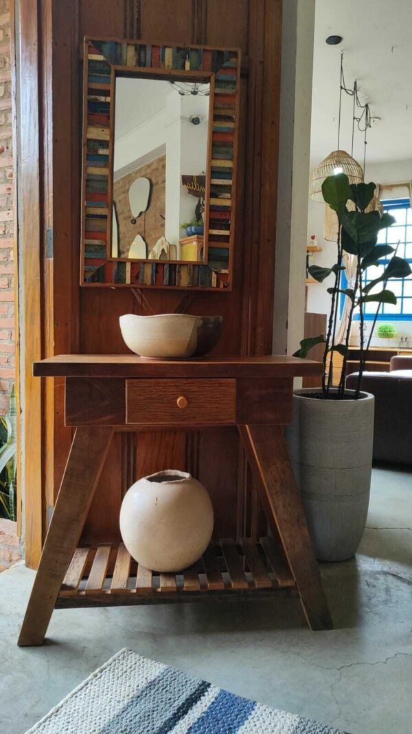 APARADOR COM SESIGN RETRÔ EM MADEIRA MACIÇA VIGOTAA PEÇA TEM UMA GAVETA E UMA PRATELEIRA RIPADA EM MADEIRA
