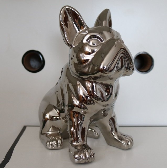 Cachorro decorativo prateado.