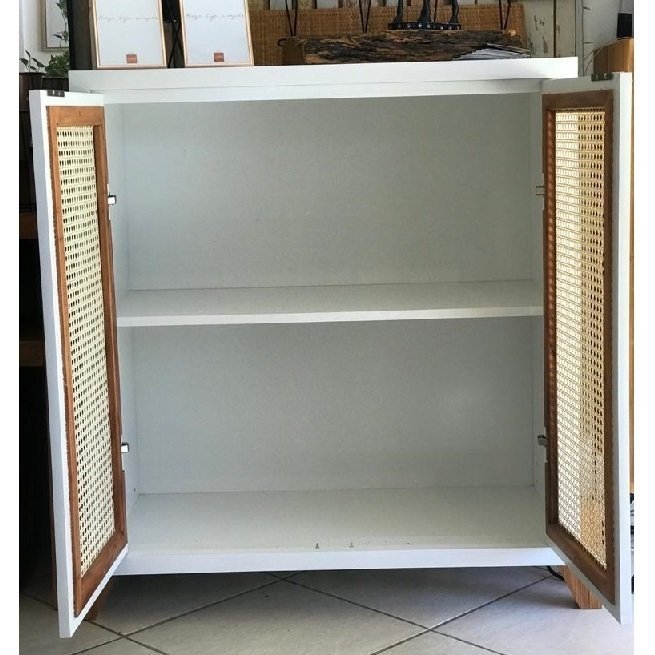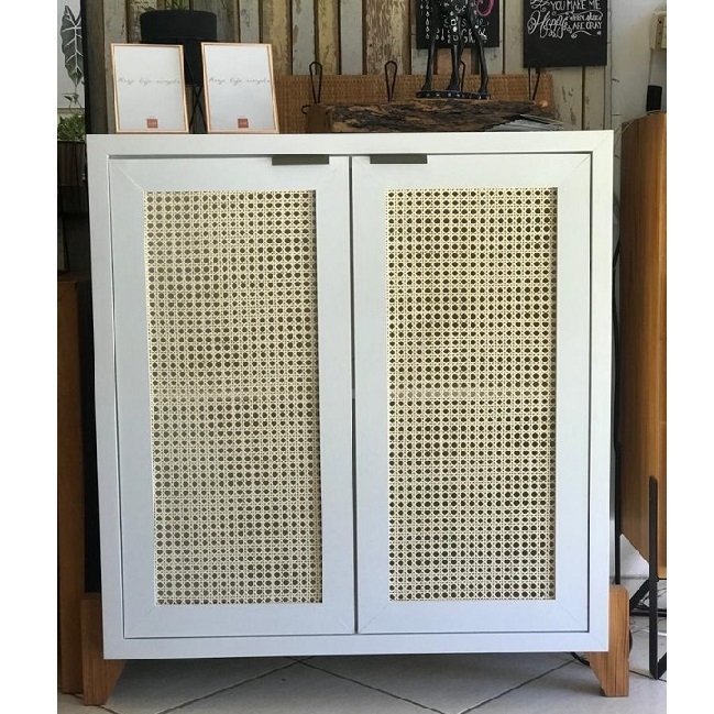 Móvel em MDF, com palha natural, e pés em madeira de demolição peroba rosa.