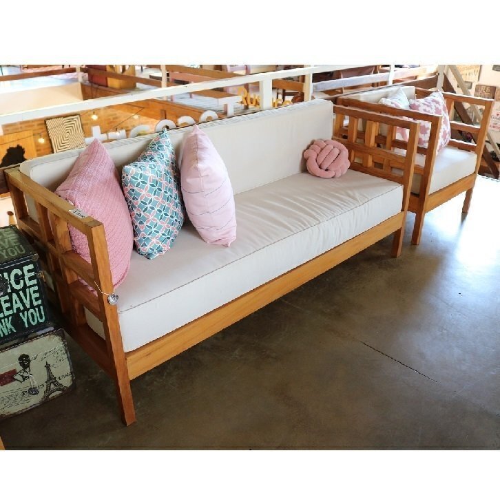 Conjunto de bancos Linha Amarra, com duas poltronas e um banco com estofado no assento e encosto em madeira de demolição peroba rosa
