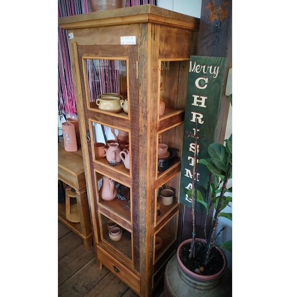 Cristaleira Torre em madeira de demolição peroba rosa com gaveta.