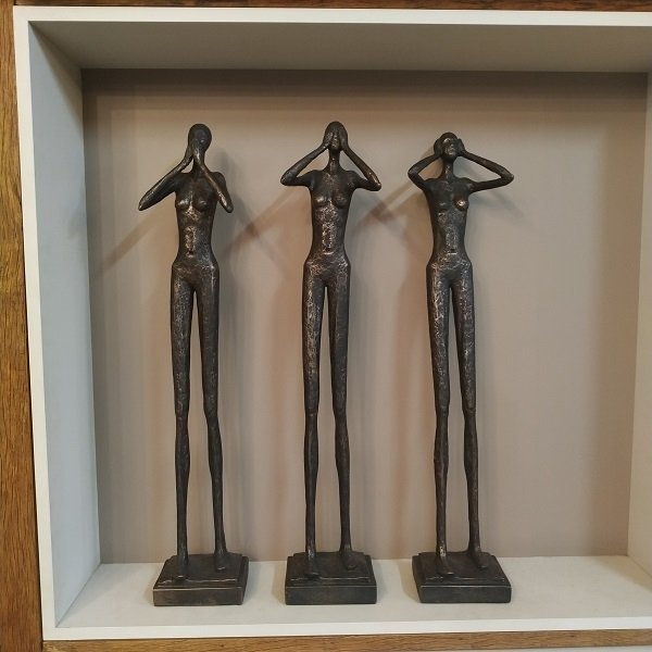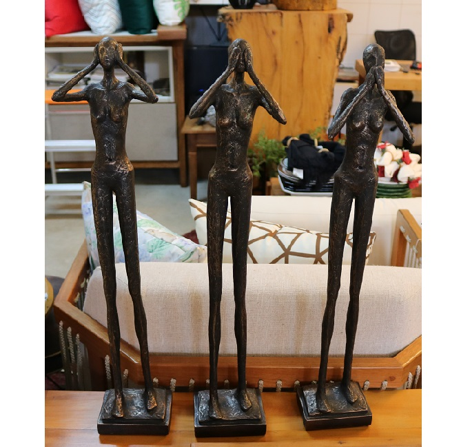 Três esculturas decorativas femininas, cego, surdo e mudo, em resina.