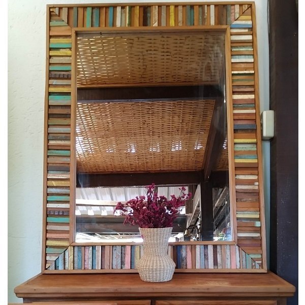 Espelho com moldura em madeira de demolição peroba rosa, ripado com pintura original.