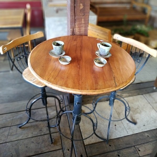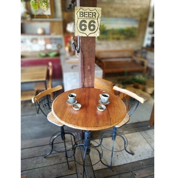 Mesa bistrô em madeira de demolição peroba rosa com pé em ferro (regulável)