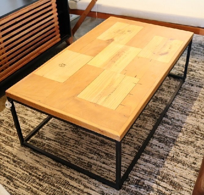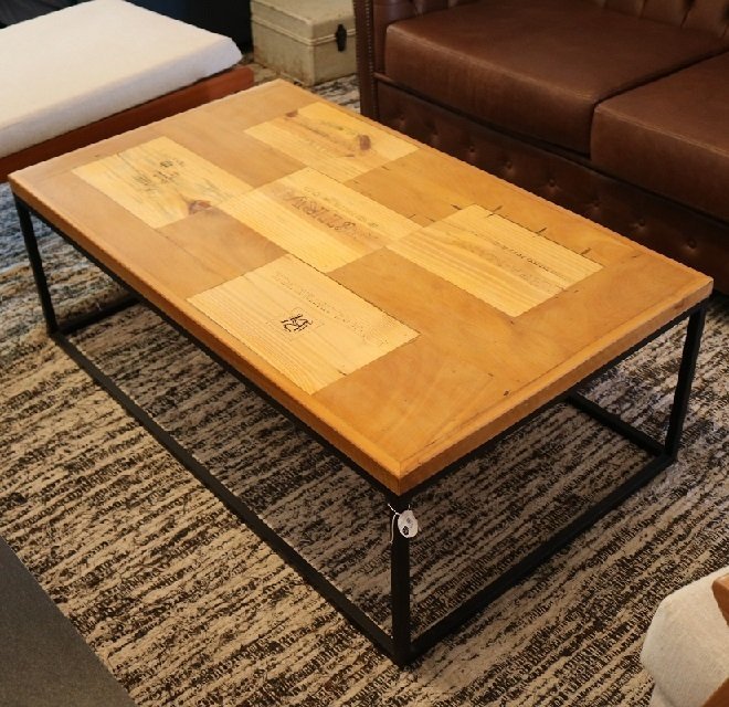 Mesa de centro com tampo em madeira de caixas de vinho e estrutura em metalon.