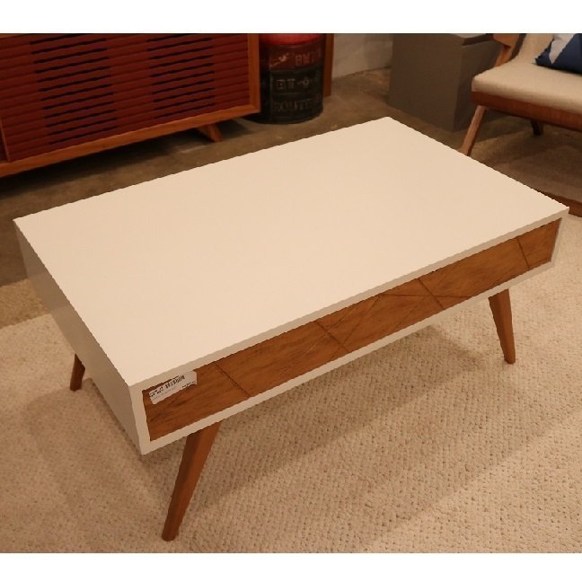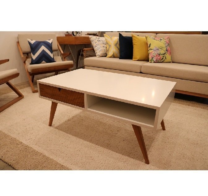 Mesa de centro Linha Freggio, em mdf colorido, com gaveta e pés em madeira de demolição peroba rosa.